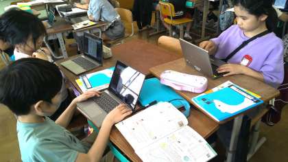 折れ線グラフを読んだりかいたりする学習をしています。より分かりやすいグラフにするために、グループで話し合っています。