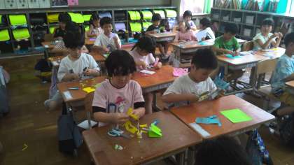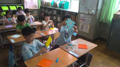 図画工作の学習では、はさみを使ってかざりを作りました。ちょきちょき切って、折り紙を広げてみると…「見てみてー」「お面みたい!」「お花みたい!」と素敵な飾りが完成して、とても嬉しそうでした。