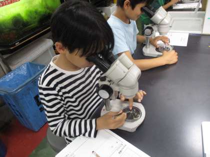 その取り出した小さな玄米や白米を双眼実体顕微鏡で見ました。みんな興味津々でじっくり観察していました。