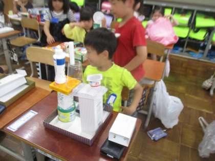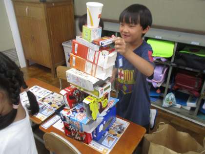 算数でいろいろなかたちについて学習しています。どうすれば積み上げやすくなるかな?どうすればうまく使えるかな?と考えながら取り組みました。