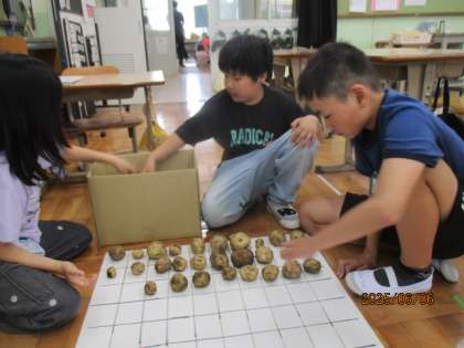 「1番重たい袋から1番軽い袋にジャガイモを移すと、大体同じくらいになるね。」