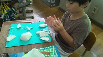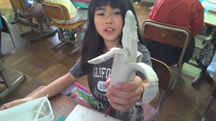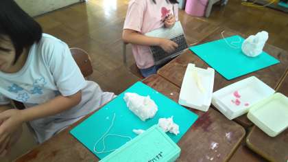 切り糸やかきべらを使って、ねん土の形を変えながら、思いついたものを表しました。