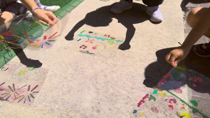 図工で「ひかりのプレゼント」の学習を行いました。透明のシートや容器に,自分の好きな絵を描いて色を塗り,好きな形に切ったカラーシートを貼りました。出来上がった作品を持って中庭に降り,光にかざして,キラキラと輝く色の移り具合を楽しみました。綺麗に映る色とりどりのプレゼントに,子どもたちは目をキラキラさせて喜んでいました。お家でも晴れの日に外に出て,光にかざして楽しんでみてください。材料のご準備等,ありがとうございました。