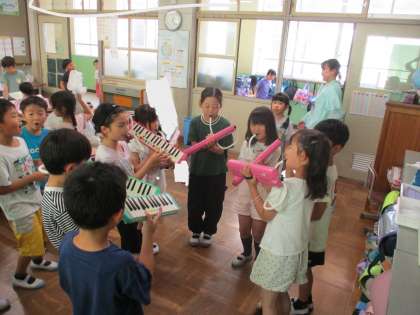 2年生の教室では,休み時間になると鍵盤ハーモニカの音色が鳴り響いています。「ドレミのうた」や「かっこう」,「メヌエット」「BINGO」など,色々な曲を練習したり,上手に演奏したりしています。この日は,皆で「かえるのうた」を輪唱形式で演奏していました。誰かが吹き出すと,誰かが続けて吹いて演奏を繋げていく,そしていつの間にか大合奏になり,「かえるの歌が〜!」と歌う歌声も聞こえてきました。教室が演奏会の会場になったようでした。