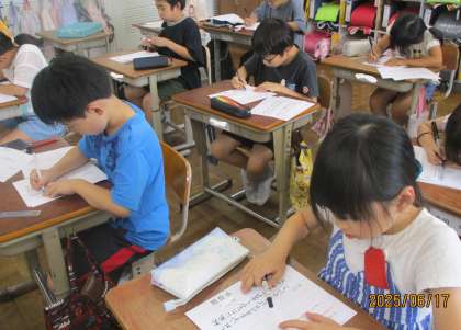 文字の大きさや、行の中心に気をつけて、ペンを使って書いています。お手本をよく見て、いつも以上に集中して頑張っていた子が多かったです。