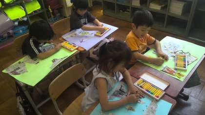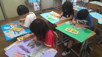 図画工作の学習では、前回ちぎった新聞紙に絵をかきました。色を付けたすことで、さらにちぎったかたちから、様々な絵がうまれました。