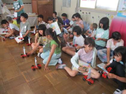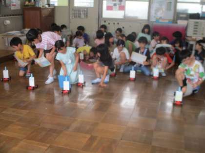 自分で作った車を教室で走らせました。下敷きで強くあおいだり、弱くあおいだりしながらどんなふうに動くのか、とても楽しそうに活動しています。