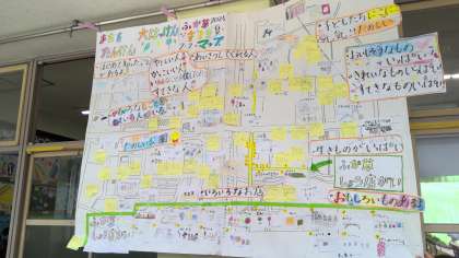 生活の学習で町探検に行きました。町探検で行った校区の様子をクラスごとに大きな地図にまとめました。ここにお店があったよ,ここには大きな道路があったよ,ここはよく行く公園だよ,といったように,自分たちで見てきたこと調べたことわかったことを絵や言葉でまとめました。自分たちだけの素敵な地図ができ,深草の町について詳しくなりました。