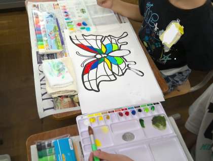 図工の学習で,魔法の薬と幻の蝶を絵の具で塗りました。絵の具の色々な色を使い混ぜ合わせることで,自分だけの様々な色を作り,丁寧に塗っていきました。水の量を調整して色を薄めたり濃くしたりすることも上手に行えていて,色とりどりの素敵な作品が出来上がりました。次回の絵の具の学習も楽しみです。ご家庭での絵の具のご準備等,ありがとうございました。