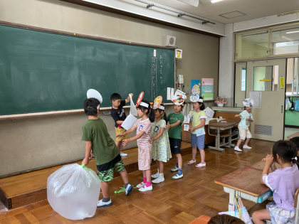 国語の学習では、「おおきなかぶ」の音読劇をしました。登場人物になりきっていました。どのグループもはきはきとした声で、動作も加えながら音読ができていました。