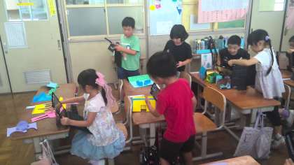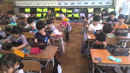 図工で作った作品を、タブレットで写真を取って送ることをしました。初めてでしたが、使い方の約束を守って、素早く送ることができていました。友達の写真をみて、「すごい!じょうず!」と、友達の良いところを見つけていました。