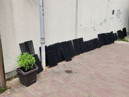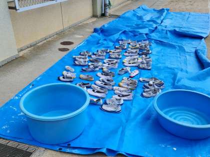 貸し出し用の上靴や各教室・特別教室のエアコンフィルターがきれいに洗われ、干されています。