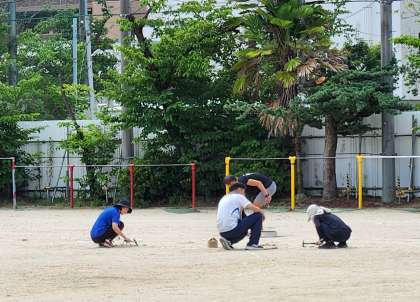 運動場のラインテープも所々切れていたので、補修をしました。