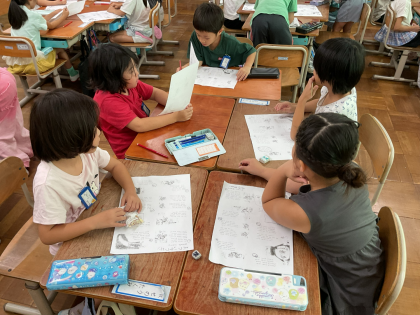 国語の学習では、「おむすびころりん」を学習しました。班でどのように音読するといいか、誰がどこを読むか子ども達で考えていました。「ねずみのところはみんなで読もう」「おどりながら読もう」など、それぞれの班で工夫していました。