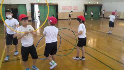 ボール、フープ、ぼうを使ってどんな遊びができるか、一人で考えたり、友達と一緒に考えたりしながら学習しています。