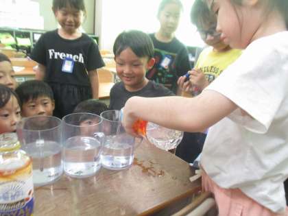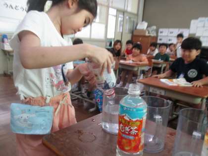 大きさのちがう容器に入った水・・・。みんなでどれが一番多いのか予想し、確かめました。意外な結果に驚きの声があがり、終始楽しい雰囲気で学習していました。