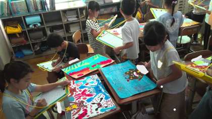 図工の学習で,「お話の絵」を描きました。「お話の絵」では,お話を聞いて感じたこと,考えたこと,想像したことを絵に表していきました。画用紙いっぱいにいきいきと描かれた絵はとても面白く,素敵な作品が出来上がりました。絵の鑑賞会では,子どもたち同士で絵を見合い,こんなお話だったなと思い出し,感想を伝え合って盛り上がっていました。