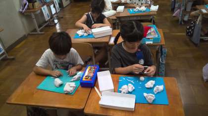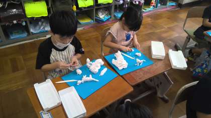 図画工作の学習では、ねんどで動物や生き物と散歩をしている様子を作りました。歌をうたいながら散歩をしている様子や、動物の上に乗って散歩をしている様子など、楽しそうな姿がねんどで表せていました。