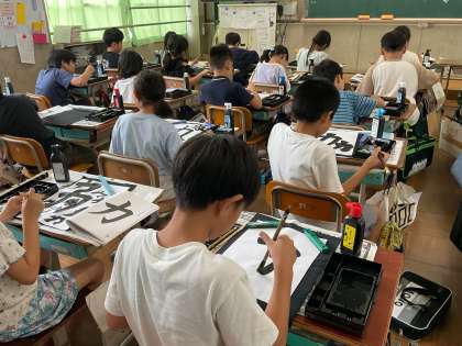 「力」の1画目の折れるところに苦手意識をもっている児童が多いようだったので、「トン」「ドン!」「グググ,,!」「ピン!」とみんなで声を合わせて書き方の確認をしました。「折れ」の力こぶのような形が美しく出た「力」を書くことができました。
