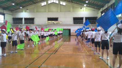 授業時間の最後になって、ようやく動きが揃ってきたので、各クラスの旗を配りました!「やっと旗が使える!!」ととても喜んで練習していました。