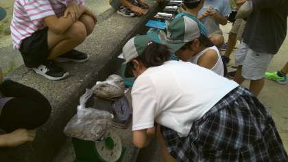 算数で「重さ」の学習をしています。はかりを使って、身近なものの重さをはかったり、1目盛りに気を付けて読んだりしています。今日は、1Kgはどのくらいなのか、砂を袋に入れて調べました。