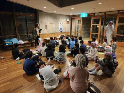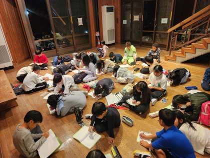 できたことやよかったこと、明日に向けてよりよくしたいことなどを一人ひとりがしおりに書いて、その後、みんなで話し合いました。