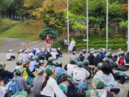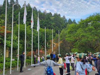 その後は、深草小学校だけの時間もあり、みんなでラジオ体操をしたり、今日の活動のめあてなどを確認しました。