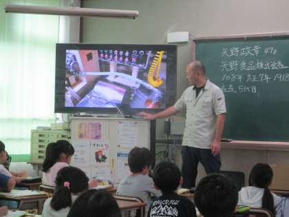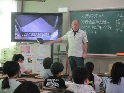 矢野食品の矢野社長に来ていただき、こんにゃくの作り方について教えていただきました。こんにゃく芋ができるまでに3年かかること・カボチャぐらいの大きさの芋になること・こんにゃくの皮をむいてこんにゃく粉にしてから海藻粉を混ぜることなど、子ども達にとって驚く話ばかりで「えー!」「そうなんやー!」と思わず声に出して反応する子がたくさんいました。