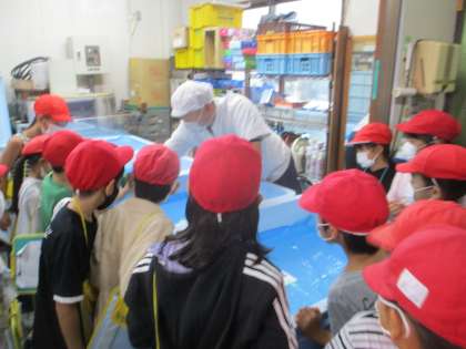 中に入ると、出来立てのこんにゃくを見せていただき、触らせていただきました。「すごく固い!」「おなかの固さみたい!」と反応が様々でした。