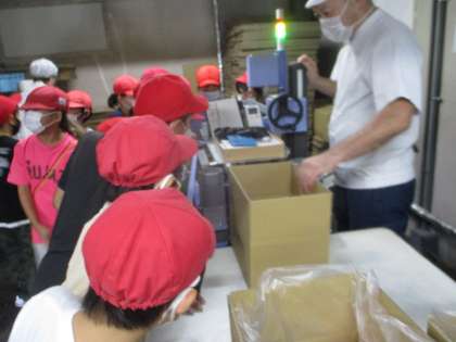 「くずきり」の製品の箱詰め作業を見せていただきました。機械を使って箱を作ってテープでとめる様子を見て、「すごく速い!」「どうなってるんやろ?」と不思議そうな様子でした。