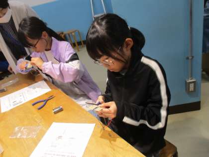 工房学習ではローム株式会社の方に教えていただき、LEDを使っての電子工作をしました。銅線などをつなげて回路ができるように、モノレンジャーの方にも手伝っていただきながら作りました。