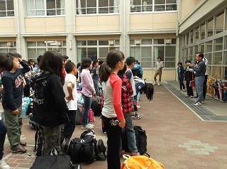 5年生は,9時,出発式を終えて,元気に花背山の家に向けて出発しました。11時20分ごろ到着予定です。「協力し合って楽しい山の家にしよう。」「仕事はすばやく常に5分前行動。」めあてに向かってがんばります。