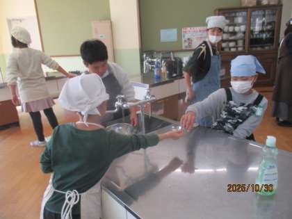 グループに分かれて、準備・後片づけや調理の工程を役割分担しながら、ミニホットケーキを作りました。