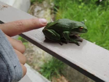 山の家の施設内を散策している子どもたちがカエルを見つけました。