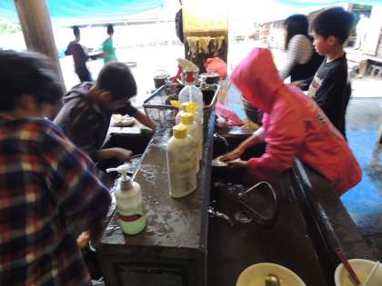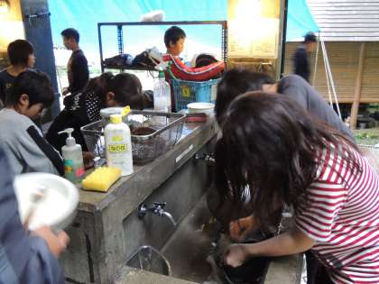 おいしく夕食をいただいた後は,みんなで後片付けです。