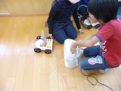 理科の授業で初めて理科室を使いました。風が弱いときと強いときで進み方の違いを比べました。