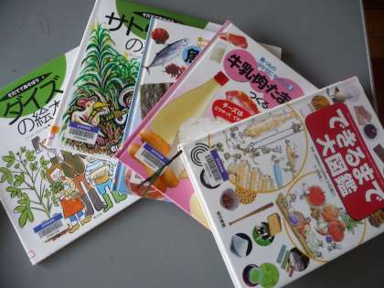 3年生の国語の教科書に載っている「すがたをかえる大豆」「食べ物のひみつを教えます」の関連図書や教科書で紹介されている本をコミュニティプラザ深草図書館に用意していただきお借りしました。