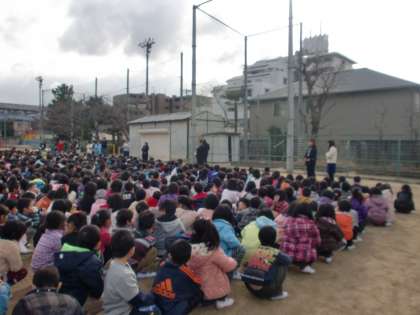 地震・火災を想定した避難訓練を行いました。緊急地震放送を静かに聴いた後,まず一次避難です。教室にいた子どもたちは先生の指示に従って,机の下に隠れ,自分の身を守りました。揺れが落ち着けば,二次避難です。「おはしもて(おさない・はしらない・しゃべらない・もどらない・ていがくねん優先)」を守りながら,ハンカチをあてて運動場の安全な場所に避難しました。真剣な態度で,すばやく避難することができました。