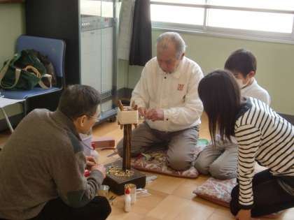 伝統工芸士会の皆様を講師にお招きして,伝統産業である組みひもの技術を教えていただき,体験しました。角台の横に糸がぶら下がっていて,この糸を交差することで上の方にひもが組まれていきます。初めての経験なので,真剣なまなざしで説明を聴いています。慎重に少しずつひもを編んでいきました。できた組みひもに金具をつけていただき,素敵なキーホルダーが出来上がりました。とても良い体験ができました。