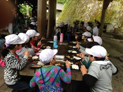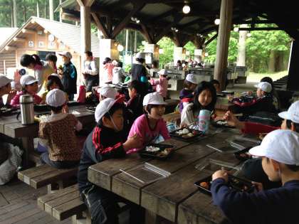 今日の昼ごはんは,野外炊飯場でハンバーグ弁当です。魚を食べた後ですか,なかなかの食欲です。