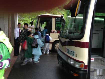 まだ雨が降っています。これからバスにのって、登山口の美山荘まで行きます。