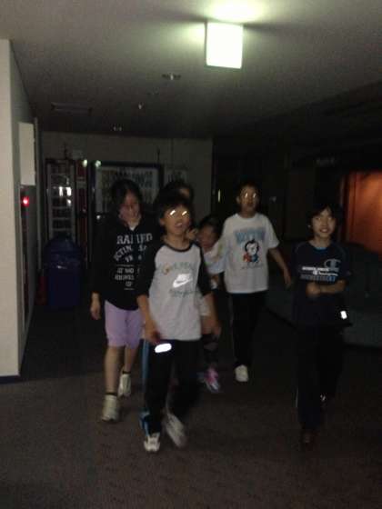 ナイトハイクに行きました。最初にちょっと怖い話を聞いたので、期待度がぐんともりあがりました。真っ暗い地下道を懐中電灯を持って、グループごとに進みます。きゃあきゃあ、もりあがりました。