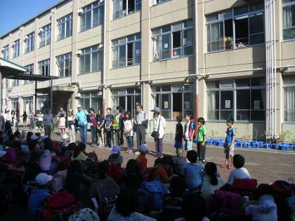 いよいよ4年生は,本日から3日間みさきの家で活動します。出発式が終わりました。お家の皆さん,準備やお見送り有難うございます。行ってきます。