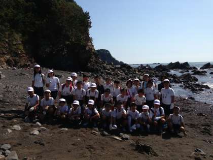 宮崎浜で集合写真を撮りました。これから磯観察です。