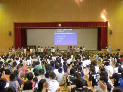 児童集会では,保健委員会の発表がありました。学校でのけがのことや けがをした場所などのクイズがありました。けがの原因で1番多いのは,うっかりあわてていた不注意のけがです。けがの起こる場所で,1番多いのは運動場です。みんな仲良く安全に心がけ,遊んだり学習したりしましょうね。