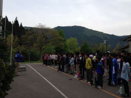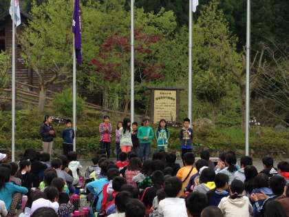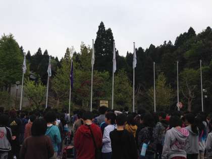 朝のつどいです。今日は、葵小、勧修小との合同です。