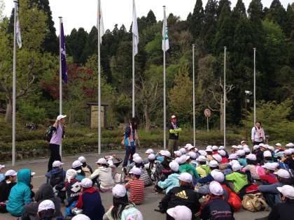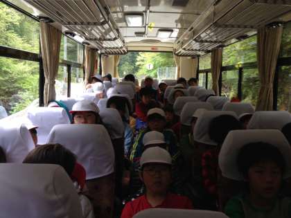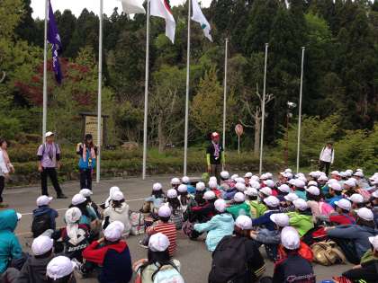 出発式をして、まず、交流の森の入り口にバスで向かいました。