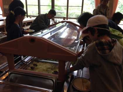 混ぜご飯とうどんのセットか、チャーハンを選びます。バイキングもあって、豪華です。