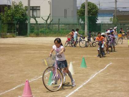 深草学区交通安全推進委員会主催の自転車教室が本校運動場で行われました。子ども達の自転車事故を未然にふせぐとともに,自転車に乗る際の正しいルールやマナーを身につけてほしいという願いから開催されました。たくさんの児童が参加しました。自転車の正しい乗り方や事故事例についてのお話をお聴きし,運動場に描いたコースを実際に走行しました。