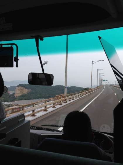 瀬戸大橋を渡り香川に入りました。中野うどん学校に到着しました。うどんが配られました。